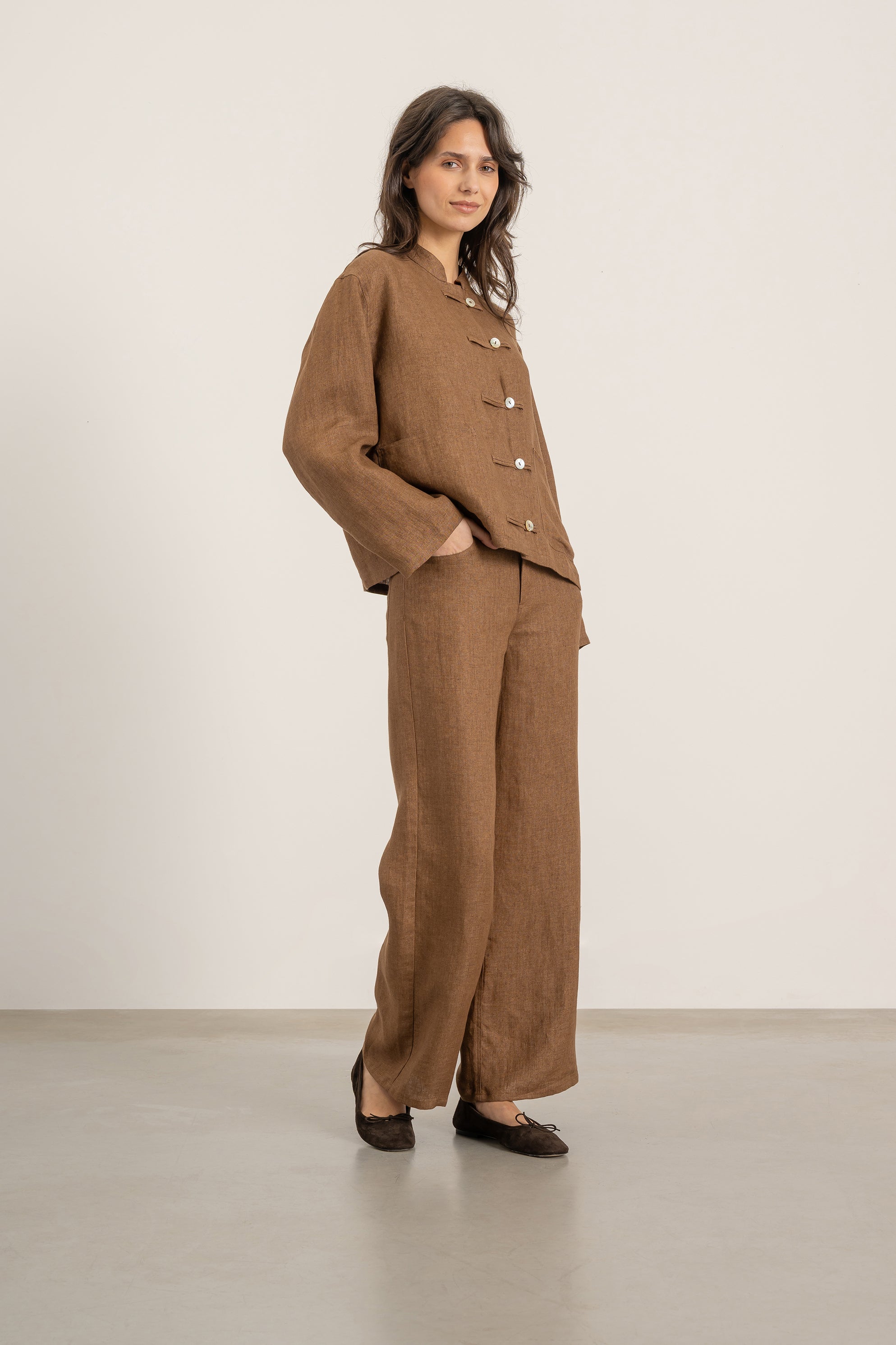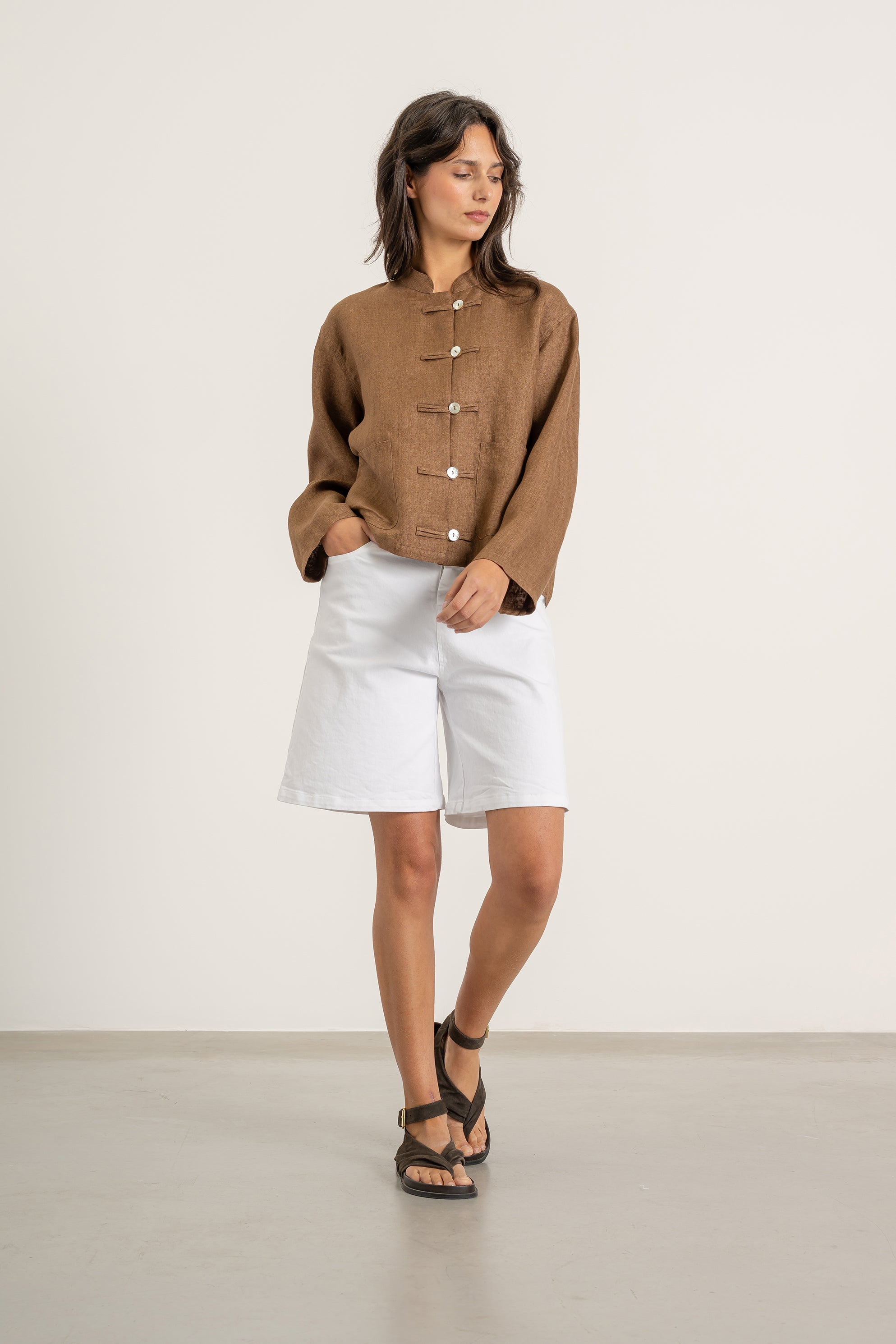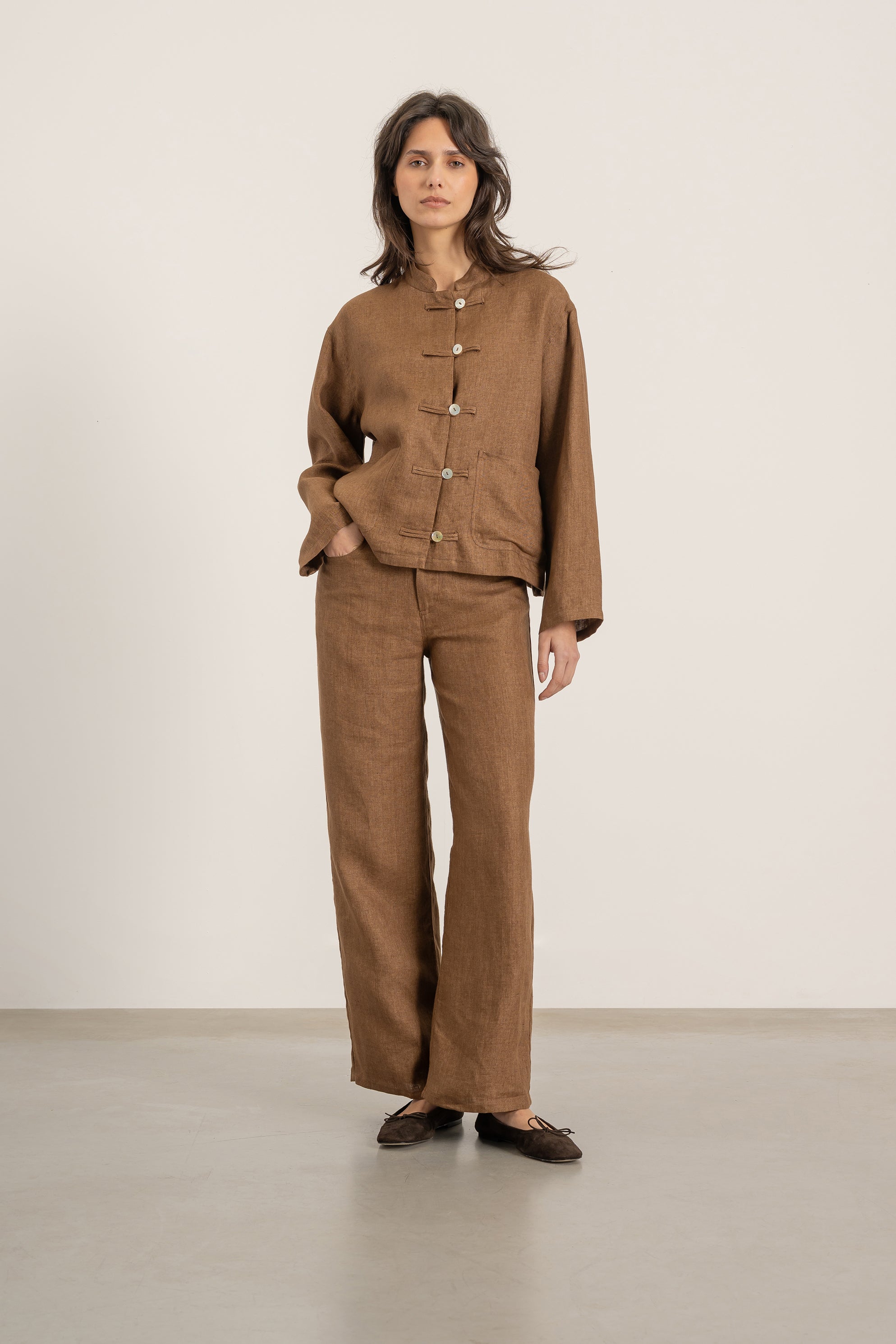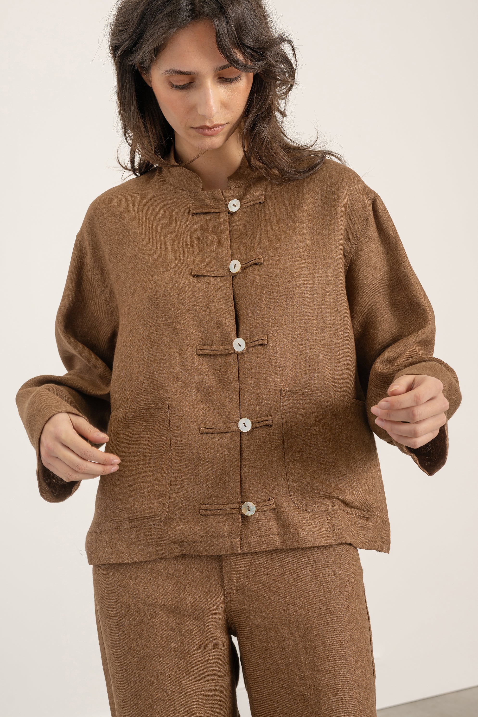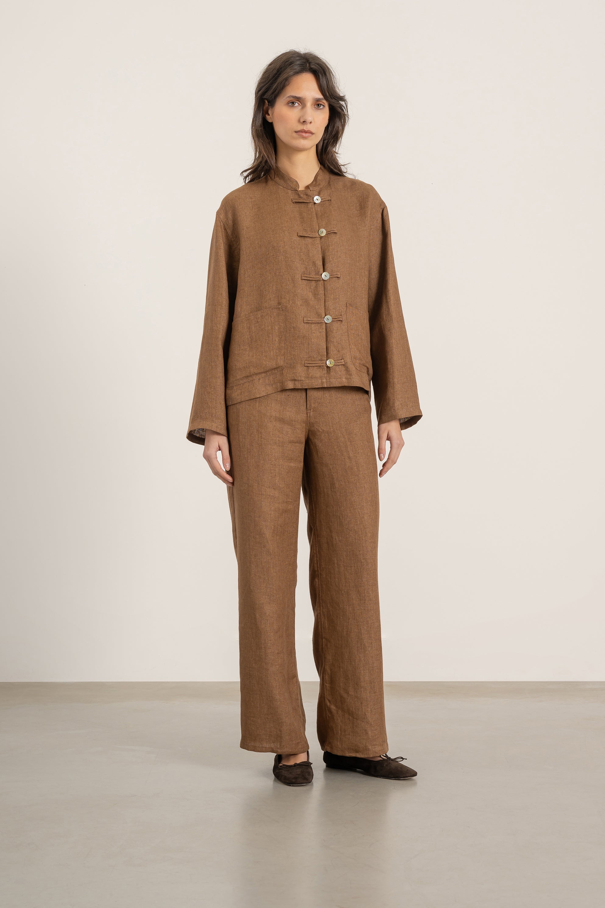 - Fermeture par liens en tissu, boutons visibles