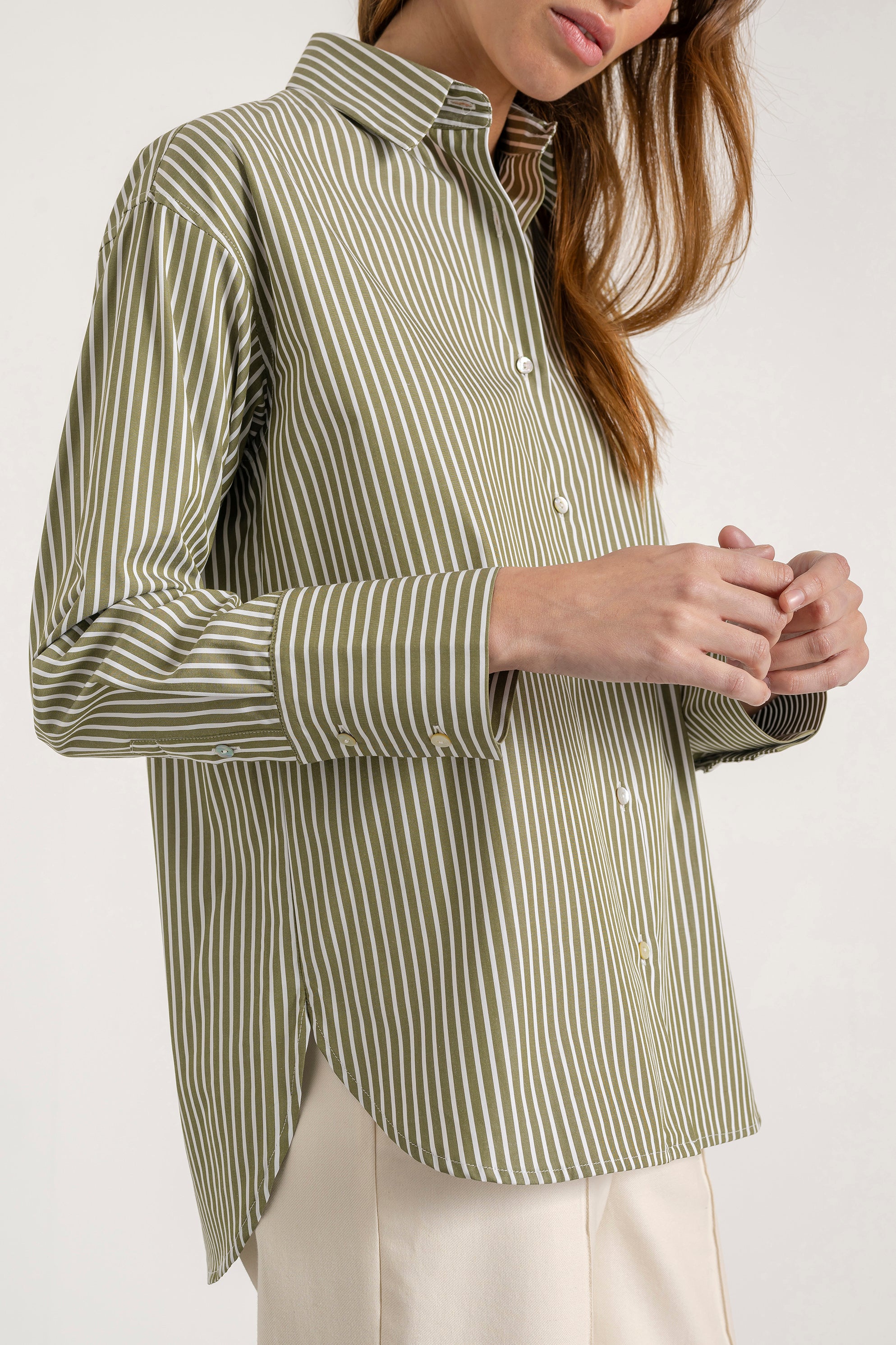 - Long sleeves with buttoned cuffs